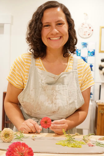 Caroline is a Virginia ceramic artist who has found a love for preserving flowers from life's most cherished moments. She loves working with hand built clay, growing flowers in her garden, and teaching art.
